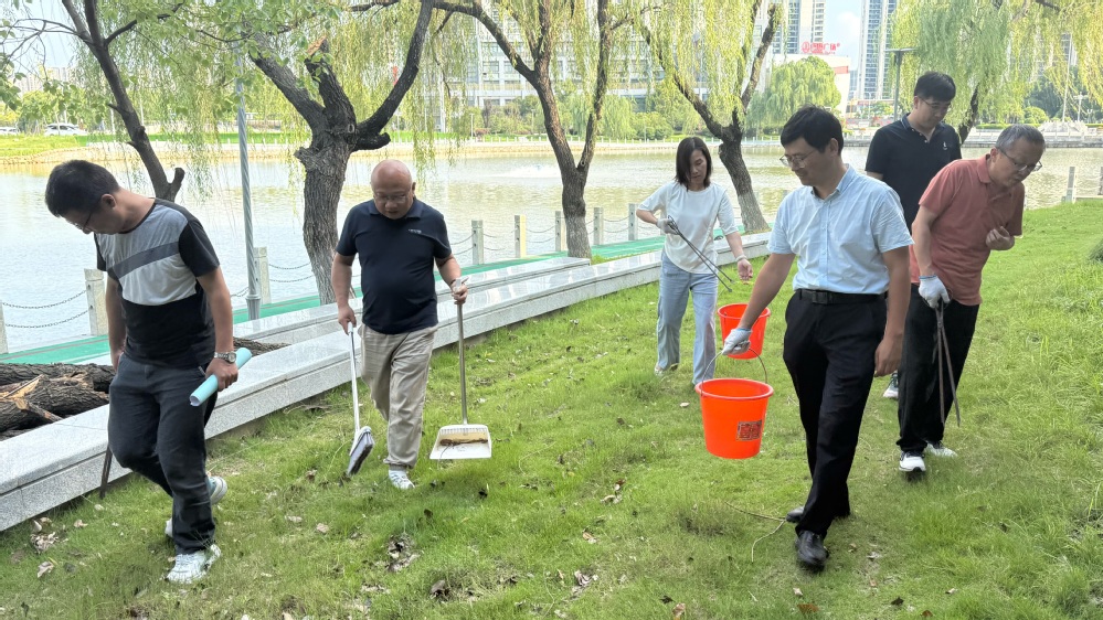随后,图文信息中心直属党支部9名党员开展了美化环境义务劳动。天气虽然炎热,但大家激情满怀,干劲十足,拿起劳动工具,弯下身子,认真清理地上的纸屑、塑料袋、杂物及枯枝败叶,让图文信息中心大楼四周变得更加干净整洁。(文、图:赵 力  审稿:许迪楼)