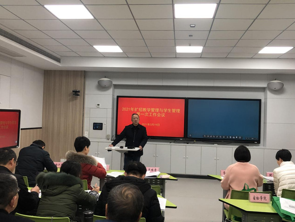 3月19日上午,2021年扩招教学管理与学生管理第一次工作会议在二号教学楼智慧教室102室召开。我校副校长谭维奇主持会议,各学院副书记、副院长,教务处、学生处、财务处、培训部主要负责人,集团成员单位分管领导及相关管理人员参加会议。