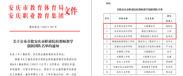 11月4日,我市发布了首批职业院校教师教学创新团队立项建设的通知,全市6所中高职院校共10个团队入选。其中,我校疏国会、王伟和张欢欢教师领衔的3个团队成功入选。本次遴选出的教师教学创新团队覆盖大数据技术、建筑装饰工程技术等专业领域,专业紧密对接我市主导产业和新兴产业。近年来,我校始终坚持“以教促产、以产助教、产教融合、产学合作”的办学模式,不断延伸教育链、服务产业链、支撑供应链、打造人才链、提升价值链,为推动形成与产业结构相匹配的安庆高质量现代职业教育结构贡献高职力量。(文:张玉国  审核:杨元纲)