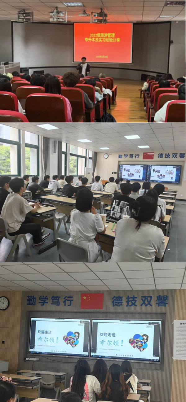 针对有求职意向的学生,通过学院网站、学工微信群、班级群等信息发布平台及时向毕业生发布各类就业信息,力争实现“就业信息全覆盖”。邀请上海祥源希尔顿HR、安庆思佰特总经理开展了专场讲座,从行业前沿动态、实际工作情况、求职面试技巧等方面帮助学生提升求职能力。同时,学院积极发动校友资源,邀请往届优秀毕业生代表进校宣讲,如2016届酒店管理专业毕业生李正--宁波钱湖国宾馆人事经理、2023届旅游管理专业毕业生韩信哲--温州畅旅国际旅游有限公司合伙人等优秀校友,同2022级学生分享成长经历、传授求职及职场工作经验,用朋辈的榜样作用引导学生转变就业观念。