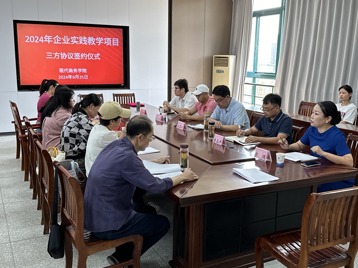 9月25日,现代商务学院与安徽云霁电子商务有限公司的2024年学生电商客服岗位实训教学项目签约仪式在学校3号教学楼510会议室举行。云霁电商公司总经理汪义德及公司相关领导,现代商务学院党总支书记、院长金启胜,该院学生工作负责人,电子商务专业负责人、跨境电子商务专业负责人以及相关班级辅导员和学生代表参加签约仪式,会议及仪式由该院教学工作负责人主持。