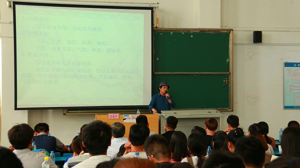 汪教授首先讲述了写字与书法、书写工具两个问题,并分别作了概述和分析,详细讲解了书写工具应该如何选用;随后他讲述了楷书的概念和选帖与临帖两个问题,同时针对我院学子的书法功底提出了选帖与临帖的建议;紧接着他重点讲述了楷书笔法和楷书结构的普遍规律两个问题,特别指出运笔要具有轻重感(力度)、快慢感(速度)和立体感(形、质、神);最后,汪教授展示出了自己的一些楷书作品与学生交流,同时为学生们讲解这些作品的特点。