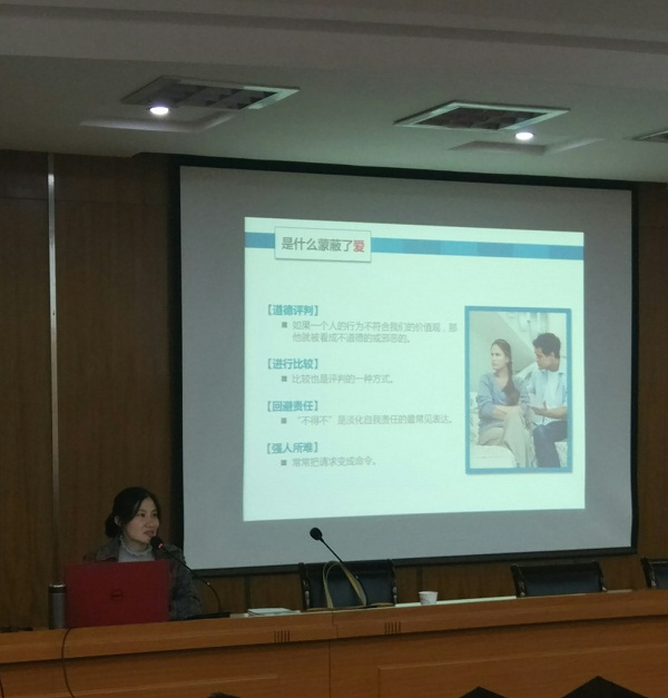 讲座中,余老师围绕“是什么蒙蔽了爱”、“如何做到非暴力沟通”、“非暴力沟通如何运用”三个方面展开。重点讲述了“非暴力沟通如何运用”,从观察、感受、需要、请求四个方面进行了详细讲解,采用了一个个真实的案例和同学们一起互动并分析原因。最后,余老师简洁明了地向我们阐述了沟通应懂得认真倾听并反馈、如何爱自己、如何表达愤怒和感激。