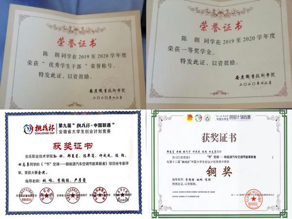 大一期间,他还利用暑假时间参加了学校组织的“互联网+”大学生创新创业大赛。虽然未取得较好成绩,但为他以后的比赛打下了坚实的基础。此后在老师的带领下,经过一点一点的进步,他也由一个不善言辞的人变成一个在台上敢于汇报发言,能够独当一面的人。通过老师的悉心指导和团队成员的不懈努力,最终他们团队取得了第九届“挑战杯”安徽省大学生创业计划竞赛金奖、第十二届“挑战杯”中国大学生创业计划大赛铜奖、首届安徽省中华职业教育创新创业大赛高职组一等奖、第九届“挑战杯”安徽省大学生课外学术科技作品竞赛二等奖等骄人成绩。