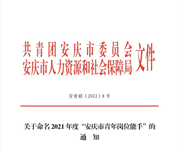 近日,共青团安庆市委员会、安庆市人力资源社会保障局印发了《关于命名2021年度“安庆市青年岗位能手”的通知》,我校教师凌中水喜获2021年度“安庆市青年岗位能手”荣誉称号。