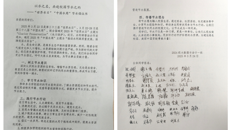 最后同学们在《以水之名,共赴校园节水之约——“世界水日”“中国水周”节水倡议书》上签上了自己的姓名。滴水在指尖,节水在心田,保护水资源、维护水环境是全社会共同的责任。同学们表示要共同践行《公民节约用水行为规范》,在生活中养成节约用水、爱护水资源的好习惯。(文:刘婷婷 图:刘婷婷 审稿:赵晓彬)
