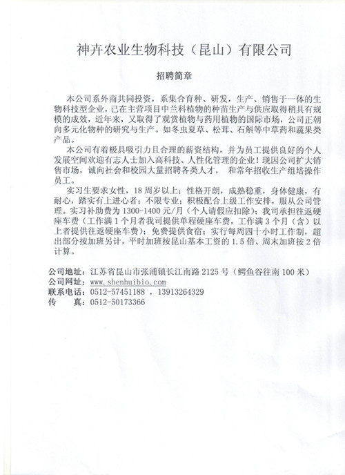 神卉农业生物科技(昆山)有限公司招聘简章