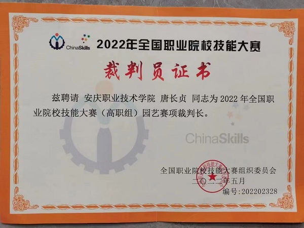 全国职业院校技能大赛是我国目前专业覆盖面最广、参赛选手最多、社会影响最大、联合主办部门最全的国家级职业院校技能赛事,充分展示了职业教育改革发展的丰硕成果,集中展现了职业院校师生的风采。2022年,唐长贞教授被大赛执委会委任“园艺”(高职组)赛项裁判长。该赛项结合了我国高职园林专业教学标准与岗位技能要求,设置园林设计与施工两个工作任务,考核内容涵盖园林施工图设计、测量、园林工程施工等方面的知识和技能。