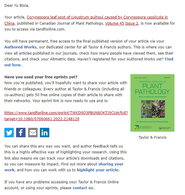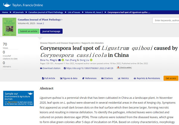 近期,校级科研平台安庆市特色种质资源与生态保护应用技术协同创新中心、农业产业化集成技术协同创新中心出最新研究成果。平台团队成员余碧霞老师根据建设目标,对校园内的植物病害进行调查、分离与鉴定,在李萍和刘冬两位博士的指导下,完成SCI类论文“Corynespora leaf spot of Ligustrum quihoui caused by Corynespora cassiicola in China”,并发表在Canadian Journal of Plant Pathology 2023年总第45卷第2期。受杂志社邀请论文实验结果图片作为本期的杂志封面。