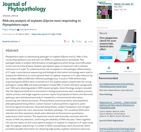 平台团队主持人李萍教授在SCI源期刊Journal of Phytopathology杂志发表题为“RNA-seq analysis of soybean (Glycine max) responding to Phytophthora sojae”的研究论文。该文章通过转录组学技术,深入挖掘了大豆响应大豆疫霉病原菌的反应机制,为大豆疫霉的防治和大豆新品种的选育提供重要参考依据。