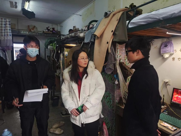 本次走访范围涵盖所有的在校学生共计千余名,走访了六幢学生公寓楼。走访的过程中,党员教师亲切询问同学们“宿舍冷不冷”“复习的如何”等问题,了解了同学们的生活和学习情况,叮嘱同学们要遵守校纪校规,注意用电安全等等。同学们对老师们的到来非常高兴,和老师们你一言我一语的热情交流,表示天气虽冷,但宿舍非常温暖,学校的学习与关爱更是让心中暖意融融。在走访时,党员老师提醒大家合理安排复习时间同时还要加强身体锻炼,保持身心健康,以充沛的精力与饱满的活力来复习备考,同时并详细地询问同学们在生活和学习中遇到的各种困难和问题,针对个别宿舍照明电源问题给出有效的解决方案。