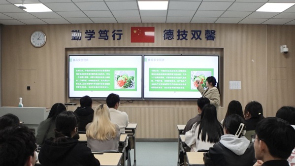 活动中,左方霞老师以“传统节日融于情 红色精神润于心”为主题给学生带来一场思想教育“盛宴”。她以清明节假期的学生安全教育为切入点,从清明节起源、各地清明节习俗出发,向同学们深度剖析了清明节背后所蕴含的文化内涵和教育意义;随后,进一步拓展主题,结合一幅幅耳熟能祥的革命先烈的图片,引导学生要缅怀先志,传承遗志。当视频中传来同龄人陈祥榕“清澈的爱,只为中国”的声音时,在场的学生无一不深深感动。食品专业金季也老师以“食出安全 品出健康”为主题,结合3.15晚会曝光的食品安全问题,以食品安全现状、提高食品安全意识、营养健康小知识为逻辑主线,不仅给学生们带来一堂别开生面的主题班会,也在其生动诙谐语言中给学生们心灵深处筑牢了一道食品安全防线。