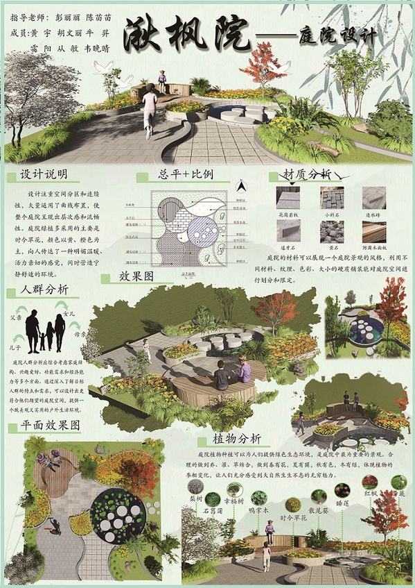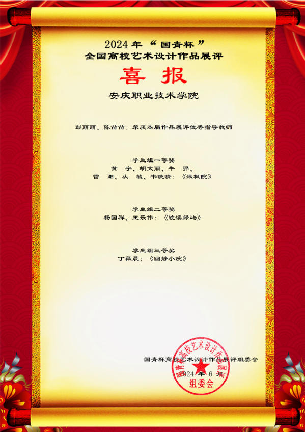 在艺术的殿堂里,每一次的挥毫泼墨都是心灵的对话,每一次的设计构思都是思想的碰撞。近日,2024年“国青杯”全国高校艺术设计作品展评活动圆满收官,在这场盛会上,我院园林技术专业彭丽丽、陈苗苗2位老师指导的9名学生提交的《湫枫院》、《皖溪绿屿》、《幽静小院》3幅作品分别获得一、二、三等奖的好成绩。
