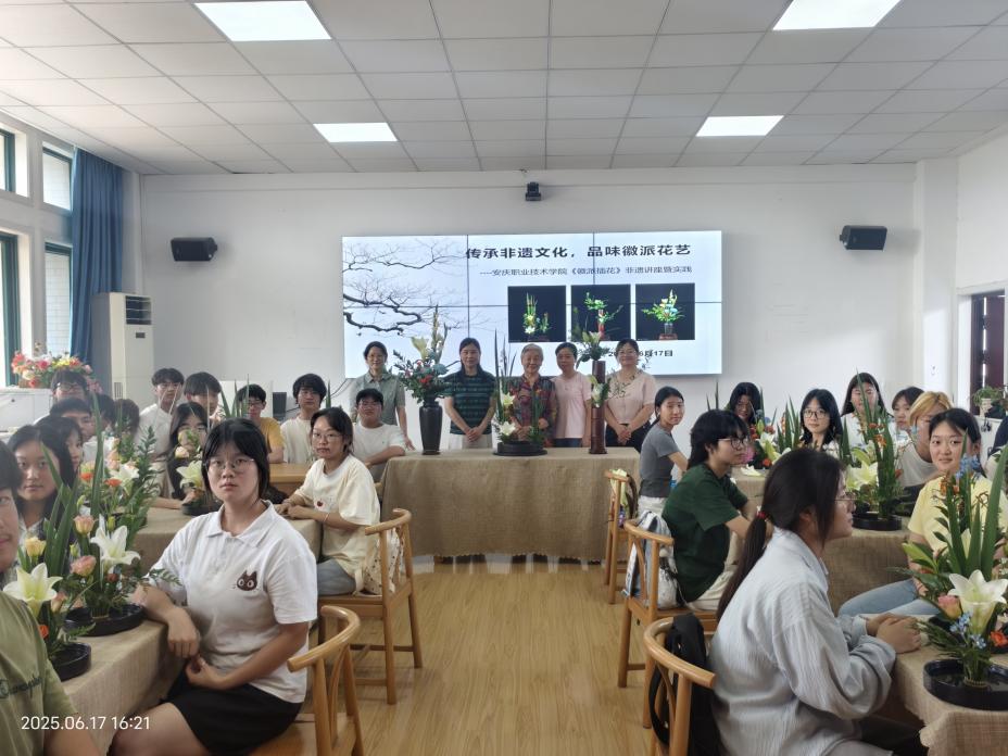 2025年6月17日,一场浸润着徽州雅韵的非遗文化盛宴在2教407花艺实训室生动上演。此次活动以“传承非遗文化,品味徽派花艺”为主题,由省级非遗“徽派插花艺术”传承人付玉兰教授及团队亲临授课,园艺技术专业的45名学生参与活动。